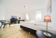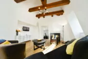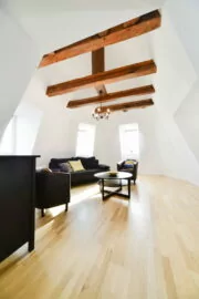Diese helle Dachgeschosswohnung eines komplett sanierten typischen Berliner Altbaus mit Lift hat 4 Zimmer. Eines davon ist ein Wohnzimmer mit Sofa (mit Schlaffunktion) und Sesseln sowie einem TV. Dieses Zimmer verfügt über hübschen Deckengebälk und hat die Anmutung eines Turmes.