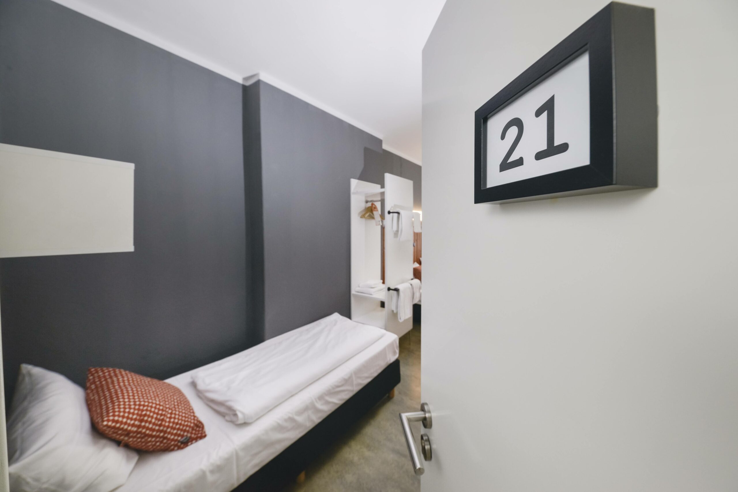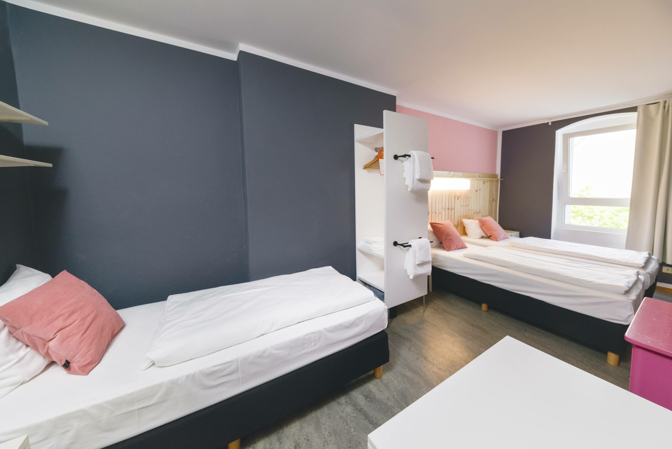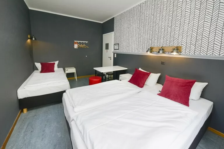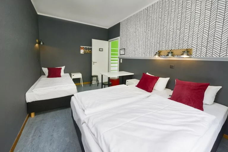 In der größten Kategorie sind unsere Zimmer mit drei rahmenlosen Einzelbetten ausgestattet. Diese können bei Bedarf auch zusammengeschoben werden. Ein Tisch und Hocker bieten die Möglichkeit, sich im eigenen Zimmer zurückzuziehen. Selbstverständlich finden Sie Platz für Ihre Kleidung. Handtücher und Bettwäsche werden kostenfrei zur Verfügung gestellt. Auf jeder Etage gibt es verschiedene Gemeinschaftsbäder für den Einzelgebrauch, um so für Privatsphäre zu sorgen. Ein Föhn befindet sich in jedem Duschbad. Die Fußbodenheizung spendet Wärme in der kalten Jahreszeit.