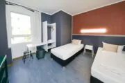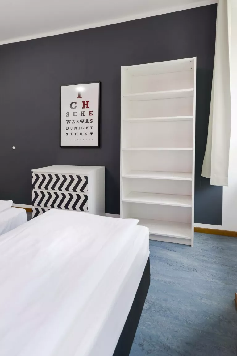 Le nostre camere doppie sono dotate di letti singoli senza cornice e possono essere facilmente unite se necessario. Nella stanza troverete un tavolo, uno sgabello e uno spazio per i vostri effetti personali. La biancheria da letto e gli asciugamani sono forniti. Su ogni piano ci sono diversi bagni condivisi ad uso individuale per garantire la privacy. Tutte le docce sono dotate di asciugacapelli. Il riscaldamento a pavimento fornisce calore nella stagione fredda.