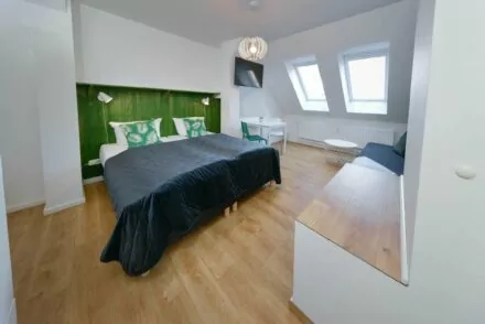Eines von 3 liebevoll eingerichteten und dekorierten Studios im Dachgeschoss unseres Old Town Hotels steht unseren Gästen für Ihre Aufenthalte in Berlin zur Verfügung. Diese Studios befinden sich im Hinterhof und sind trotz der zentralen Lage des Gebäudes sehr ruhig. Sie sind über unseren Hoteleingang mit dem Lift erreichbar. Alle Studios sind mit dem gleichen Standard eingerichtet aber die Grundrisse sowie die Dekoration sind verschieden.