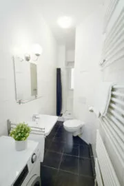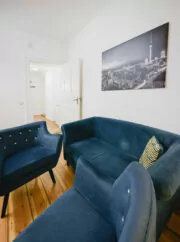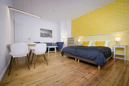 Diese schöne Wohnung im 2.OG verfügt über 2 Zimmer mit jeweils 2 Einzelbetten, die zusammengeschoben ein Doppelbett ergeben. Ein Raum ist ein Durchgangszimmer. Sie finden ein Sofa, eine Kommode und einen Kleiderschrank sowie einen Esstisch mit Stühlen. Die Küche ist komplett ausgestattet und verfügt über eine Kaffeemaschine, Wasserkocher, Toaster, Backofen und Herd, einen Kühlschrank und Töpfe, Pfannen und Kochutensilien. Das Badezimmer hat eine Badewanne. Diese Wohnung ist sehr zentral und dennoch ruhig. Sie ist optimal für ein Paar oder Freunde/Kollegen, die eine Wohnung teilen. Das Haus hat keinen Aufzug. Die Straßenbahnlinie M4 hält direkt vor der Tür. In wenigen Minuten erreichen Sie den Alexanderplatz oder die Ringbahn.
